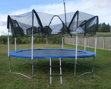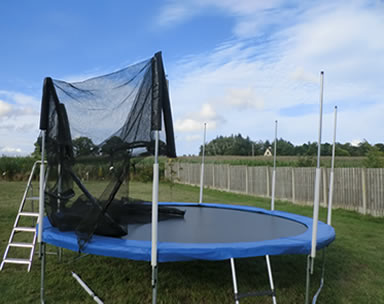 Lastly, tie the straps that come at end of the trampoline netting around the frame and hook onto the trampoline jump mat eyelets or suitable secure point.